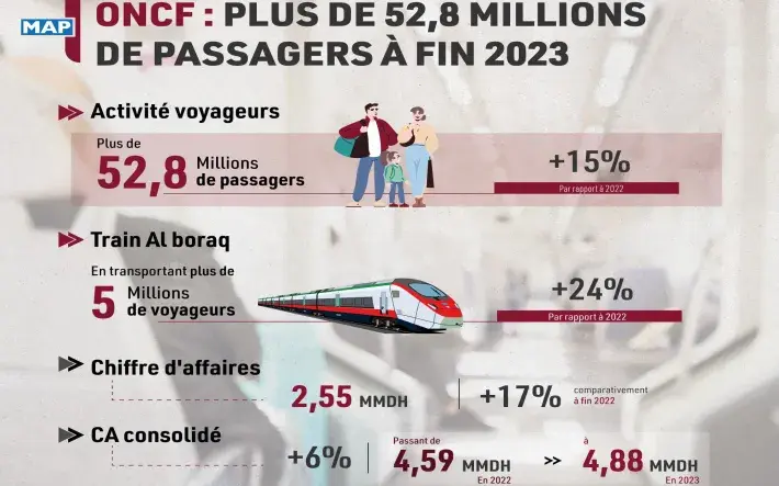 أكد نشاط نقل المسافرين للمكتب الوطني للسكك الحديدية نموه خلال سنة 2023، بتسجيل أزيد من 52,8 مليون مسافر، أي ارتفاع نسبته 15 في المائة مقارنة بسنة 2022.