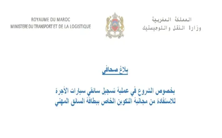 في إطار تفعيل التزاماتها المرتبطة بمجانية التكوينات الإجبارية من أجل الحصول على بطاقة السائق المهني، تنهي وزارة النقل واللوجيستيك أنها ستشرع في عملية تسجيل سائقي سيارات الأجرة بصنفيها الأول والثاني المزاولين الراغبين في الحصول على بطاقة السائق المهني أو تجديد صلاحيتها، وذلك ابتداء من 08 أبريل 2022 إلى غاية 30 يونيو 2022.