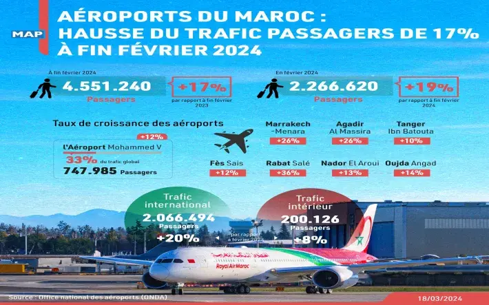 وتم خلال شهر فبراير وحده، تسجيل ارتفاع قوي بنسبة 19 في المائة، حيث بلغ عدد المسافرين 2.266.620 مسافرا، حيث استقبل مطار محمد الخامس، الذي يمثل 33 في المائة من إجمالي حركة النقل الجوي، 747.985 مسافرا بنسبة نمو تقدر بـ 12 في المائة، مقارنة مع شهر فبراير من سنة 2023.