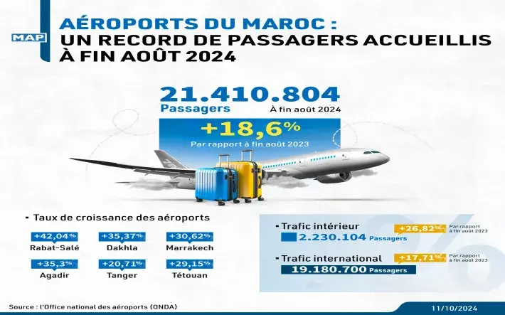 أوضح بلاغ للمكتب، أن هذا النمو يتعلق بأغلب المطارات، بما في ذلك مطار الرباط سلا (زائد 42,04 في المئة)، والداخلة (زائد 35,37 في المئة)، ومراكش (زائد 30,62 في المئة)، وأكادير (زائد 35,3 في المئة)، وطنجة (زائد 20,71 في المئة)، وتطوان (زائد 29,15 في المئة).
