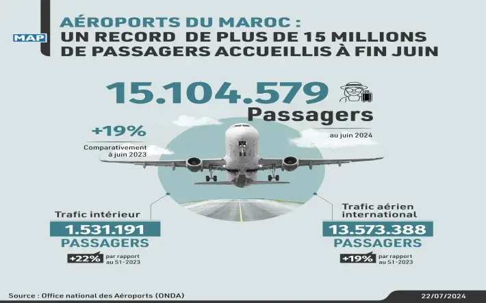 أفاد المكتب الوطني للمطارات بأن المطارات المغربية سجلت رقما قياسيا جديدا خلال الأشهر الستة الأولى من سنة 2024، بما مجموعه 15.104.579 مسافرا، أي بزيادة بنسبة 19 في المائة مقارنة بنفس الفترة من سنة 2023.