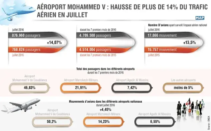 Selon un rapport de l’Office national des aéroports (ONDA), cette hausse est due au nombre des passagers ayant transité par l’aéroport Mohammed V de Casablanca qui s’est établi à 876.960 passagers en juillet 2016 contre 768.824 passagers durant la même période de l’année dernière.