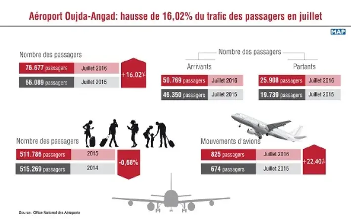 Oujda, 29/08/2016 (MAP), Quelque 76.677 passagers ont utilisé l’aéroport Oujda-Angad au cours du mois de juillet dernier, un chiffre en hausse de 16,02 pc par rapport à la même période de l'année dernière (66.089 voyageurs).