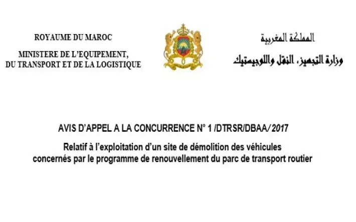 Le Jeudi 20 Avril 2017 à 10 Heures, il sera procédé, dans les bureaux de la Direction des Transports Routiers et de la Sécurité Routière, relevant du Ministère de l’Equipement, du Transport et de la Logistique sis à Charie Mâe AI Ainaine Agdal Rabat, à l’ouverture des plis relatifs à l’appel à la concurrence pour l’exploitation d’un site de démolition des véhicules concernés par le programme de renouvellement du parc de transport routier.