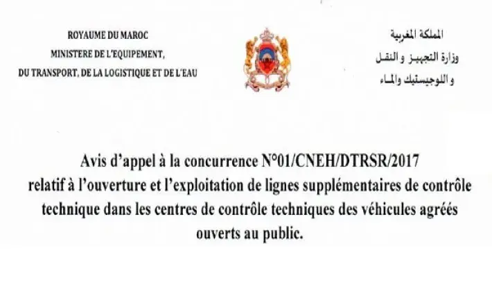 Avis d'appel à la concurrence n°01/CNEH/DTRSR/2017 relatif à l'ouverture et l'exploitation de lignes supplémentaires de contrôle technique dans le centre de contrôle technique des véhicules agréés ouverts au public.