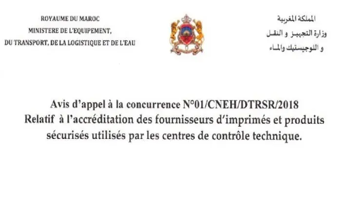 Avis d’appel à la concurrence N°01/CNEH/DTRSR/2018 relatif à l’accréditation des fournisseurs d’imprimés et produits sécurisés utilisés par les centres de contrôle technique