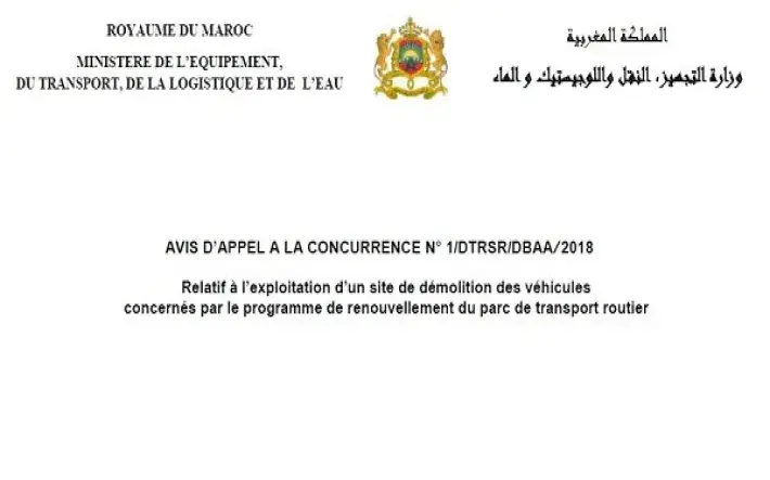 Le 26 Juillet 2018 à 10 Heures, il sera procédé, dans les bureaux de la Direction des Transports Routiers et de la Sécurité Routière, relevant du Ministère de l’Equipement, du Transport, de la Logistique et de l’Eau sise à Charie Mâe AI Ainaine Agdal Rabat, à l’ouverture des plis relatifs à l’appel à la concurrence pour l’exploitation d’un site de démolition des véhicules concernés par le programme de renouvellement du parc de transport routier.