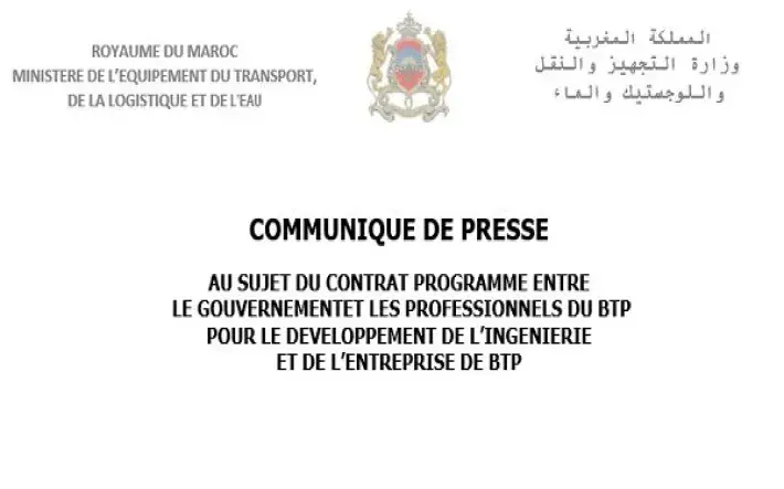 Le Ministère de l’Equipement, du Transport, de la Logistique et de l’Eau a organisé le mercredi 18 avril 2018, une réunion avec les représentants des Départements Ministériels concernés, pour l’examen du contrat programme entre l’Etat et la Fédération Nationale du Bâtiment et des Travaux Publics (FNBTP) et la Fédération Marocaine du Conseil et de l’Ingénierie (FMCI), et ce dans le cadre du suivi périodique pour l’élaboration de la version finale dudit contrat.
