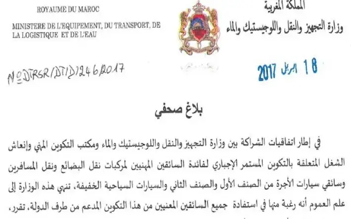 Face au faible afflue des conducteurs concernés par cette formation durant les premiers mois de l’année 2017 contrairement à la cadence croissante enregistrée depuis le lancement de cette opération, dont le taux de remplissage a dépassé la capacité de l’offre à la fin de l’année 2016, et qui a été essentiellement derrière la prise de décision de cette prolongation qui vise à permettre au reste des conducteurs de profiter de ladite formation dans les meilleurs conditions, le Ministère de l’Equipement, du Transport, de la Logistique et de l’Eau renouvelle son appel à tous les conducteurs concernés de procéder à la régularisation de leur situation relative à la possession de l’un des documents suivants, lors de la conduite à titre professionnelle :