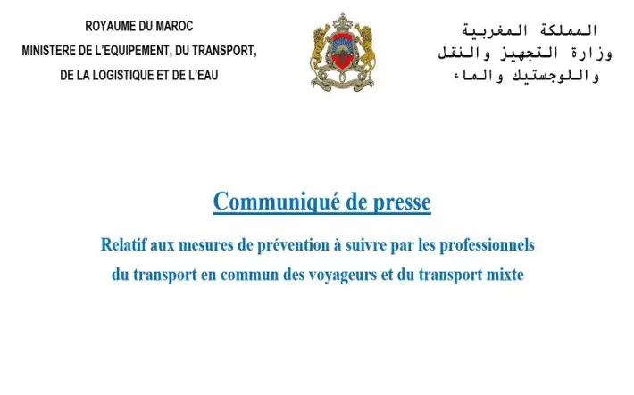 Dans le cadre des mesures de prévention continues visant la lutte contre la propagation du virus COVID-19, suite aux mesures de prévention émises par le Ministère de la Santé et le Ministère de l’Intérieur concernant le transport en commun des voyageurs, et veillant à la sécurité des professionnels et des voyageurs, le Ministère de l’Equipement, du Transport, de la Logistique et de l’Eau appelle l’ensemble des professionnels du transport en commun des voyageurs et du transport mixte, de ne pas engager plus de 50% de la capacité maximale de chaque véhicule, tout au long du trajet, avec la nécessité de respecter les règles de sécurité sanitaire recommandées par le Ministère de la Santé, et de veiller à la désinfection des véhicules de transport après chaque transfert, ainsi que d’éviter dans la mesure du possible tout contact direct entre les usagers et les voyageurs.