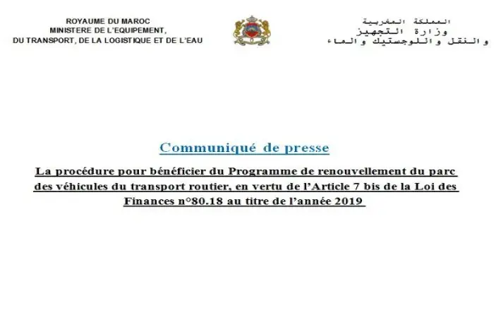 Communiqué de presse sur la procédure pour bénéficier du Programme de renouvellement du parc des véhicules du transport routier, en vertu de l’Article 7 bis de la Loi des Finances n°80.18 au titre de l’année 2019