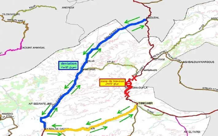 Le Ministère de l’Equipement, du Transport, de la Logistique et de l’Eau informe le public que la circulation sera coupée le Mercredi 25 Novembre 2020 de 08H00 à 18h00 sur le tronçon de la route régionale n° 703 reliant Imilchil et Tinghir, et ce, pour achever les travaux d’élimination et de dégagement des pierres rocheuses instables présentant le risque d’effondrement au niveau de la section reliant le barrage et les gorges de Toudgha.