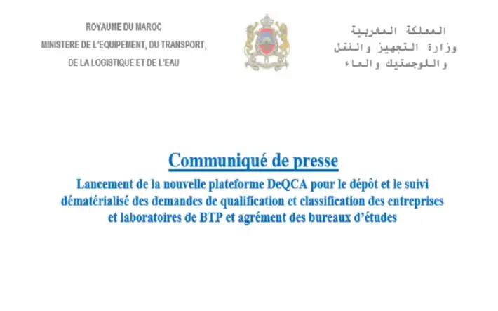 En contribution à la transformation digitale du secteur du BTP au Maroc, et dans le cadre de la poursuite du processus de dématérialisation et d’amélioration de la qualité du service rendu aux professionnels du BTP, le Ministère de l’Equipement, du Transport, de la logistique et de l’Eau lance la nouvelle plateforme en ligne DeQCA, permettant la gestion dématérialisée des demandes de qualification/classification et d’agrément.