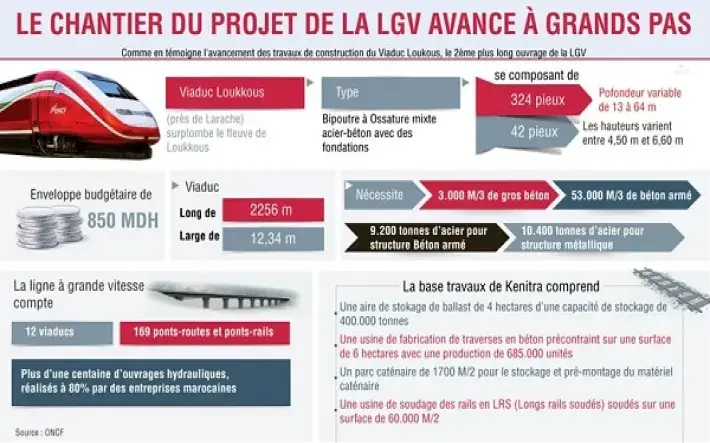 Le Viaduc Loukkous (près de Larache) qui surplombe le fleuve de Loukkous, est de type Bipoutre à Ossature mixte acier-béton avec des fondations se composant de 324 pieux de profondeur variable de 13 à 64 m et 42 appuis dont les hauteurs varient entre 4,50 m et 6,60 m, a souligné Khairane Khalid, directeur de construction de la ligne à grande vitesse,relevant de l’ONCF dans une présentation du chantier.