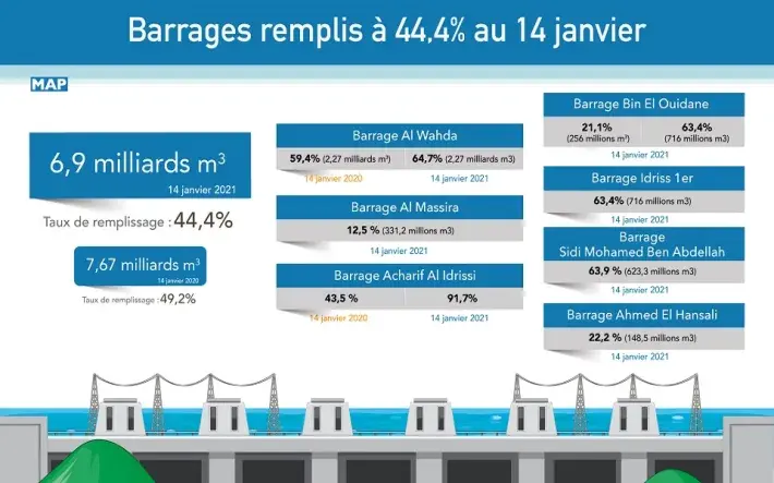Les retenues des principaux barrages nationaux ont atteint, au 14 janvier 2021, plus de 6,9 milliards de mètres cubes, soit un taux de remplissage de 44,4%, selon la Direction Générale de l'Eau, relevant du Ministère de l'Équipement, du transport, de la logistique et de l'eau, notant que ce niveau est inférieur aux 7,67 milliards de m3 (49,2% de taux de remplissage) enregistrés à la même date de l'année écoulée.