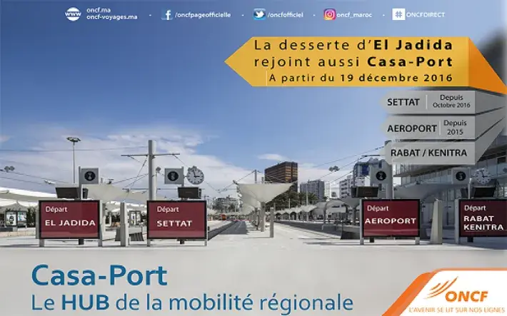 Ainsi, après le transfert à Casa-port des dessertes de l’aéroport Med V et de Settat, la desserte d’EL Jadida sera aussi transférée à la gare de Casa Port et ce à partir du 19 Décembre 2016. Désormais, les départs et les arrivées de tous les trains d’El Jadida se feront de et vers la Gare de Casa Port au lieu de la gare d’Ain Sebaa.