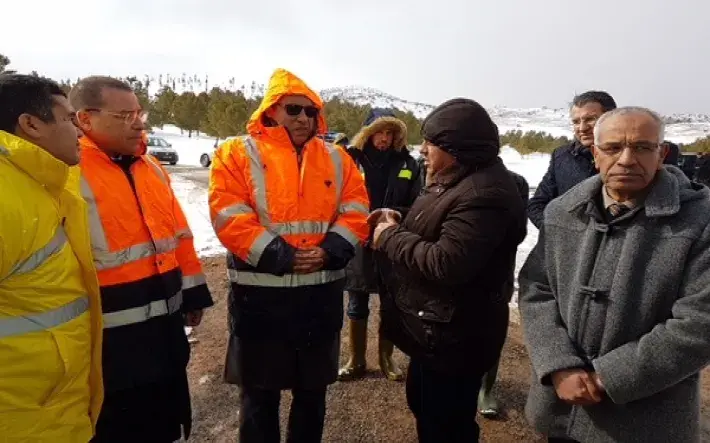 En marge du Conseil National de l’Entreprise (CNE) organisé par la Confédération Générale des Entreprises du Maroc (CGEM) Drâa Tafilalet à Errachidia, le mardi 6 Février 2018, Monsieur le Ministre de l’Equipement, du Transport, de la Logistique et de l’Eau accompagné du Wali de la Région de Drâa Tafilalet, a effectué une visite à la section routière enneigée de la RN13 entre Midelt et Errich au niveau du Col de Tizi N’talghomt ayant une altitude de 1907 m. Les travaux de déneigement étaient en cours et la circulation a été ouverte aux usagers de la route (toutes sortes de véhicules).