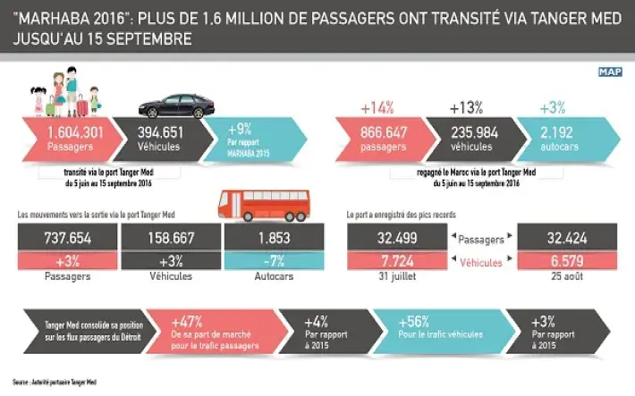 Ainsi, 866.647 passagers, 235.984 véhicules et 2.192 autocars ont regagné le Maroc via le port Tanger Med, depuis le début de l'opération Marhaba 2016, le 5 juin dernier jusqu’au 15 septembre, en hausse respective de 14 pc, 13 pc et de 3 pc par rapport à la même période de 2015, a indiqué un communiqué de l’Autorité portuaire sur le bilan de l’opération "Marhaba 2016", parvenu samedi à la MAP.