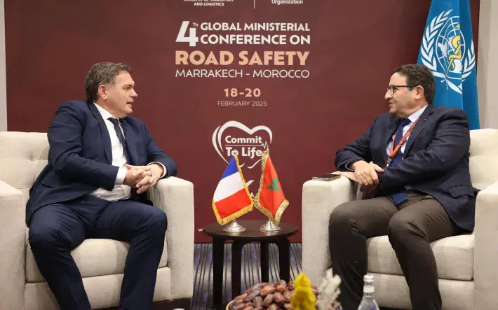 Monsieur Abdessamad KAYOUH, Ministre du Transport et de la Logistique, s'est entretenu, le lundi 17 février 2025 à Marrakech, avec Monsieur Philippe TABAROT, Ministre Délégué Chargé des transports de la République de France et ce, en marge de la tenue de la 4è Conférence Ministérielle Mondiale sur la Sécurité Routière.
