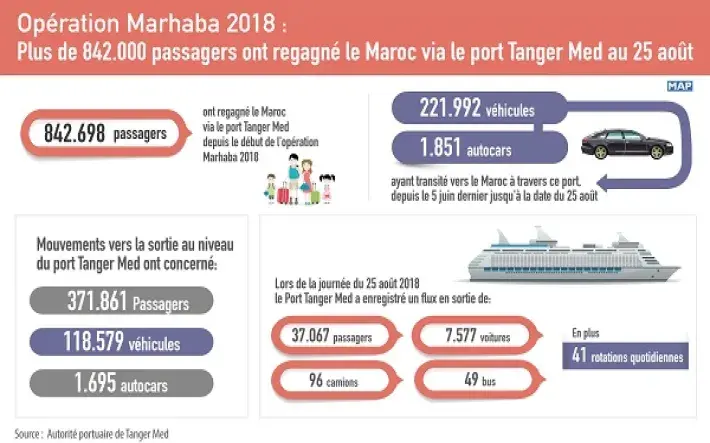 Quelque 842.698 passagers ont regagné le Maroc via le port Tanger Med depuis le début de l'opération Marhaba 2018, le 5 juin dernier, jusqu'au 25 août.