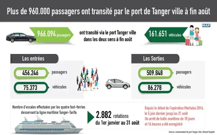 Pour sa part, le nombre d'escales effectuées par les quatre fast-ferries desservant la ligne maritime Tanger-Tarifa a atteint 2.882 rotations, du 1er janvier au 31 août, a fait savoir M. Ouqebli, notant que depuis le début de l'opération Marhaba 2016, le 5 juin dernier jusqu’au 31 août, un arrêt de trafic maritime de 10 jours et 16 heures a été enregistré, en raison de la fermeture du port de Tarifa, à cause du mauvais temps.