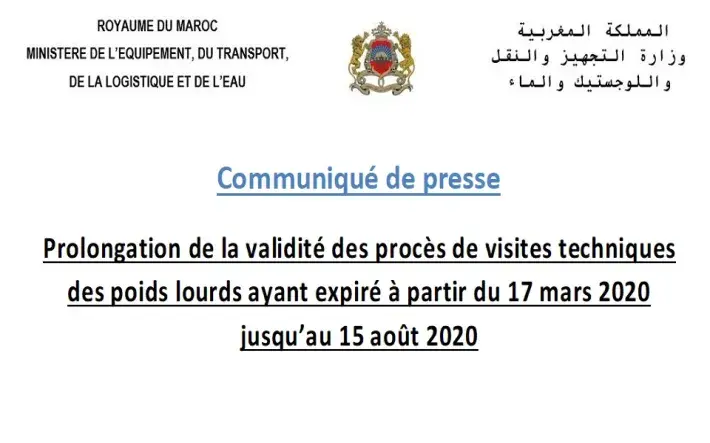 Le Ministère de l’Equipement, du Transport, de la Logistique et de l’Eau porte à la connaissance des professionnels du transport routier, que suite aux instructions de Monsieur le Ministre de l’Equipement, du Transport, de la Logistique et de l’Eau, il a été procédé à la prolongation de la validité des procès de visites techniques des véhicules de poids lourds, ayant expiré à partir du 18 mars 2020, et qui a été annoncée par l’Agence Nationale de la Sécurité Routière (NARSA). A cet effet, il a été décidé de prolonger la validité des pièces de transport relatives à ces véhicules, qui ont expiré à partir du 17 mars 2020 et ce, jusqu’au 15 août 2020, avec l’obligation de disposer d'un reçu de réservation de rendez-vous pour le contrôle technique du véhicule avant la date du 15 août 2020, délivré par un centre de visite technique des véhicules agréé.