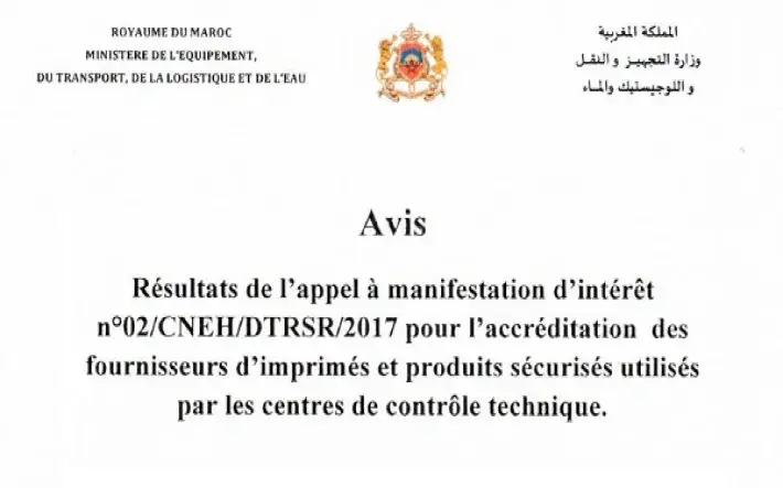 Résultats de l’appel à manifestation d’intérêt n°02/CNEH/DTRSR/2017 pour l’accréditation des fournisseurs d’imprimés et produits sécurisés utilisés par les centres de contrôle technique