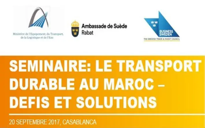 Dans le cadre de la démarche environnementale volontariste du Maroc et de la Suède dans le domaine du transport durable, le Ministère de l'Equipement, du Transport, de la Logistique, et de l’Eau et l’Ambassade de Suède à Rabat, en partenariat avec Business Sweden, organiseront un séminaire international sur le transport durable sous le thème : « le transport durable au Maroc : défis et solutions » et ce, le 20 septembre 2017 à Casablanca.