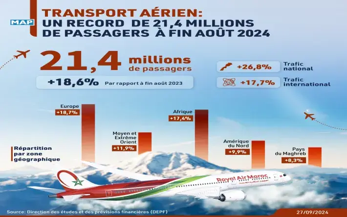 Le trafic aérien des passagers a atteint un nouveau record avec 21,4 millions de passagers à fin août, en hausse de 18,6%, par rapport à la même période un an auparavant, selon la Direction des études et des prévisions financières (DEPF) relevant du ministère de l'Economie et des Finances.