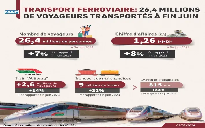 Le nombre de voyageurs transportés par l'Office National des Chemins de Fer (ONCF) s'est élevé à 26,4 millions de personnes durant le premier semestre 2024, en hausse de 7% par rapport à la même période un an auparavant.